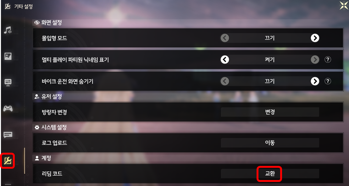 3. 기타 설정 탭에서 리딤 코드 [교환] 클릭