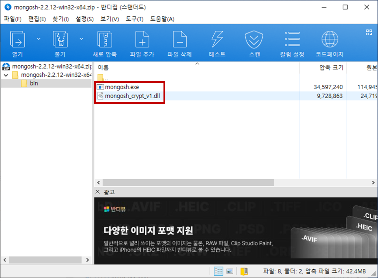 - mongosh.exe 파일과 mongosh_crypt_v1.dll 파일을 기존 MongoDB 설치경로에 압축풀기를 합니다.