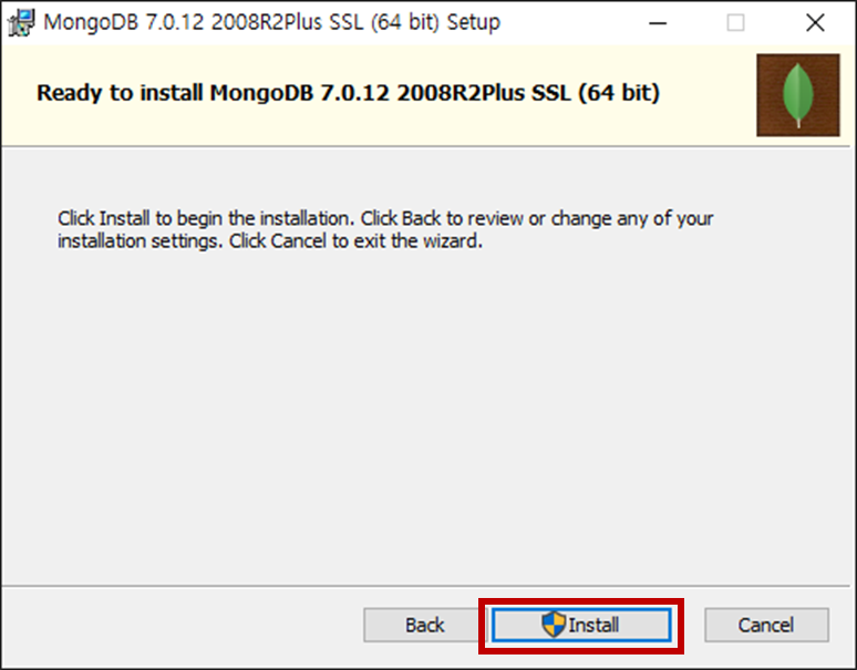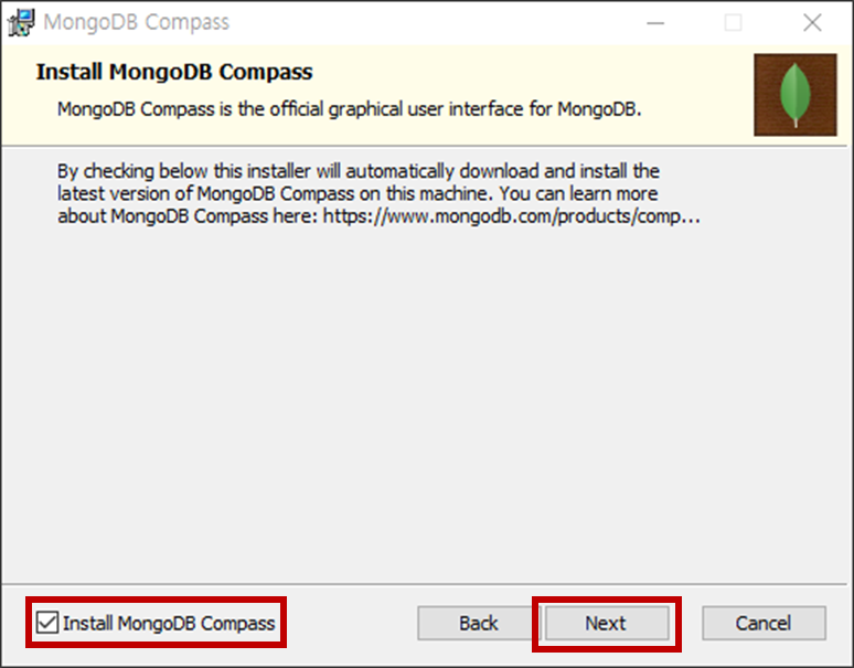 - "Install MongoDB Compass" 체크박스를 선택하고 [Next] 버튼을 누릅니다.