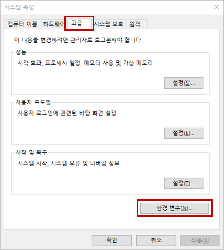 - 아래와 같이 [고급] 탭을 클릭한 뒤, [환경 변수] 버튼을 클릭합니다.