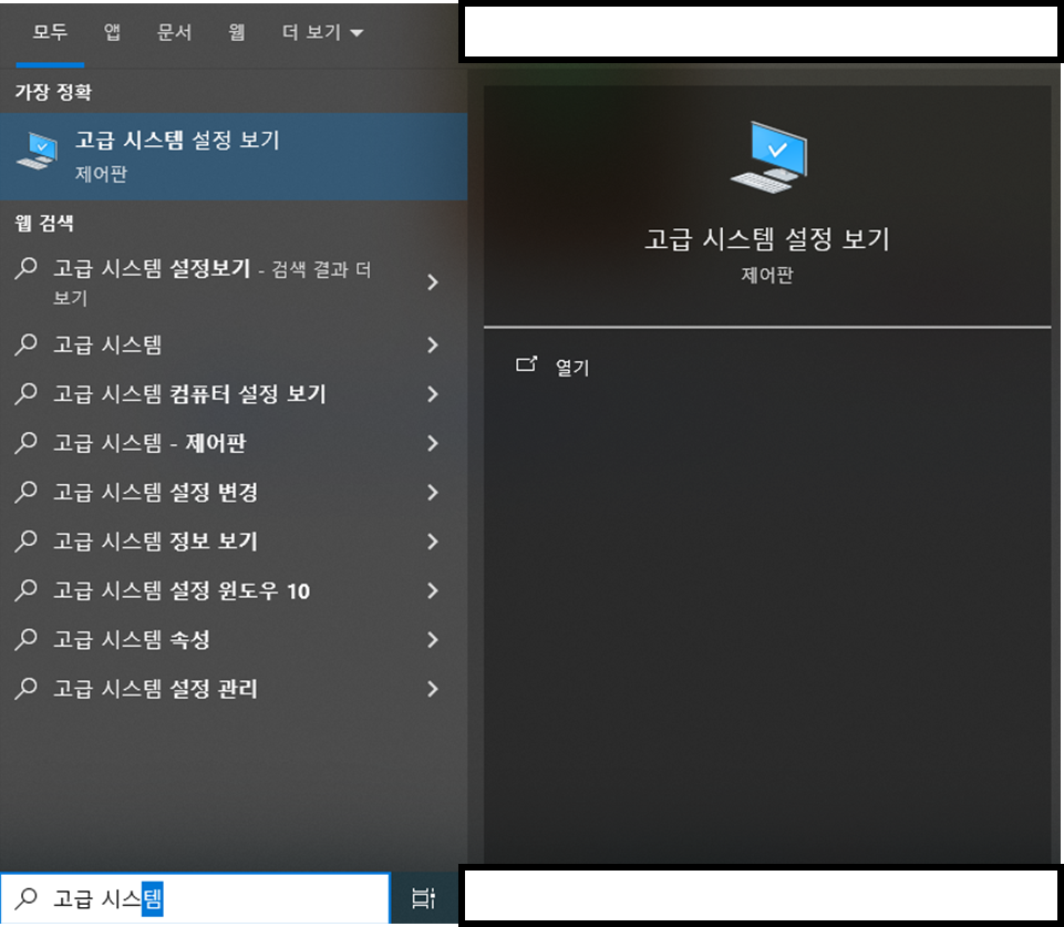 - 찾기에 "고급 시스텝 설정"을 입력하여 실행합니다.