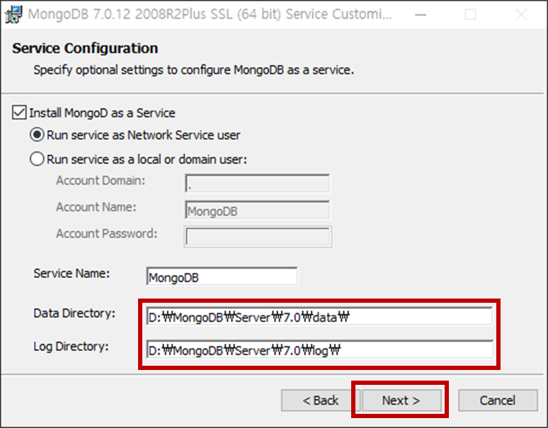 - 앞 서 [Complete] 버튼을 눌렀다면 [Next] 버튼을 누릅니다. 만약 [Custom] 버튼을 클릭하여 경로를 지정한 경우, 아래 표시된 Data Directory와 Log Directory 경로를 수정합니다.