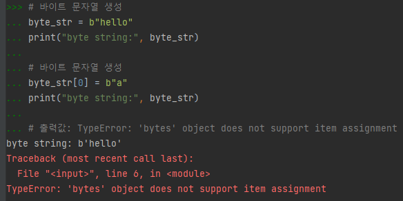 - 바이트 문자열(b"hello")은 불변 객체이기 때문에,