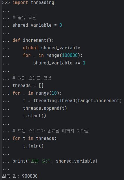 - 따라서 shared_variable의 최종 출력값은 10 * 100,000 = 1,000,000이 되어야 합니다.