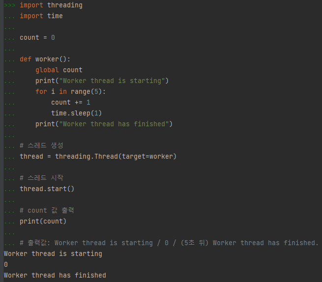 # 출력값: Worker thread is starting / 0 / (5초 뒤) Worker thread has finished.