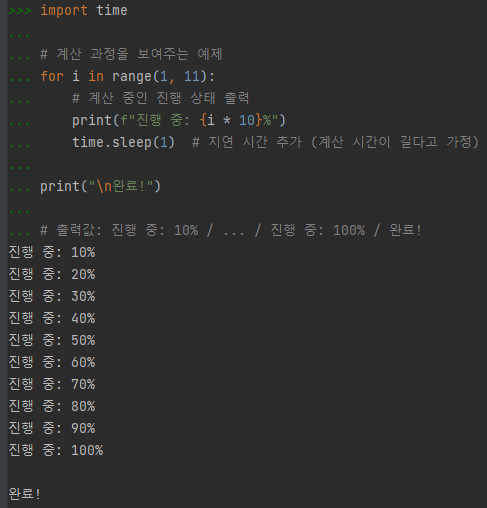 # 출력값: 진행 중: 10% / ... / 진행 중: 100% / 완료!
